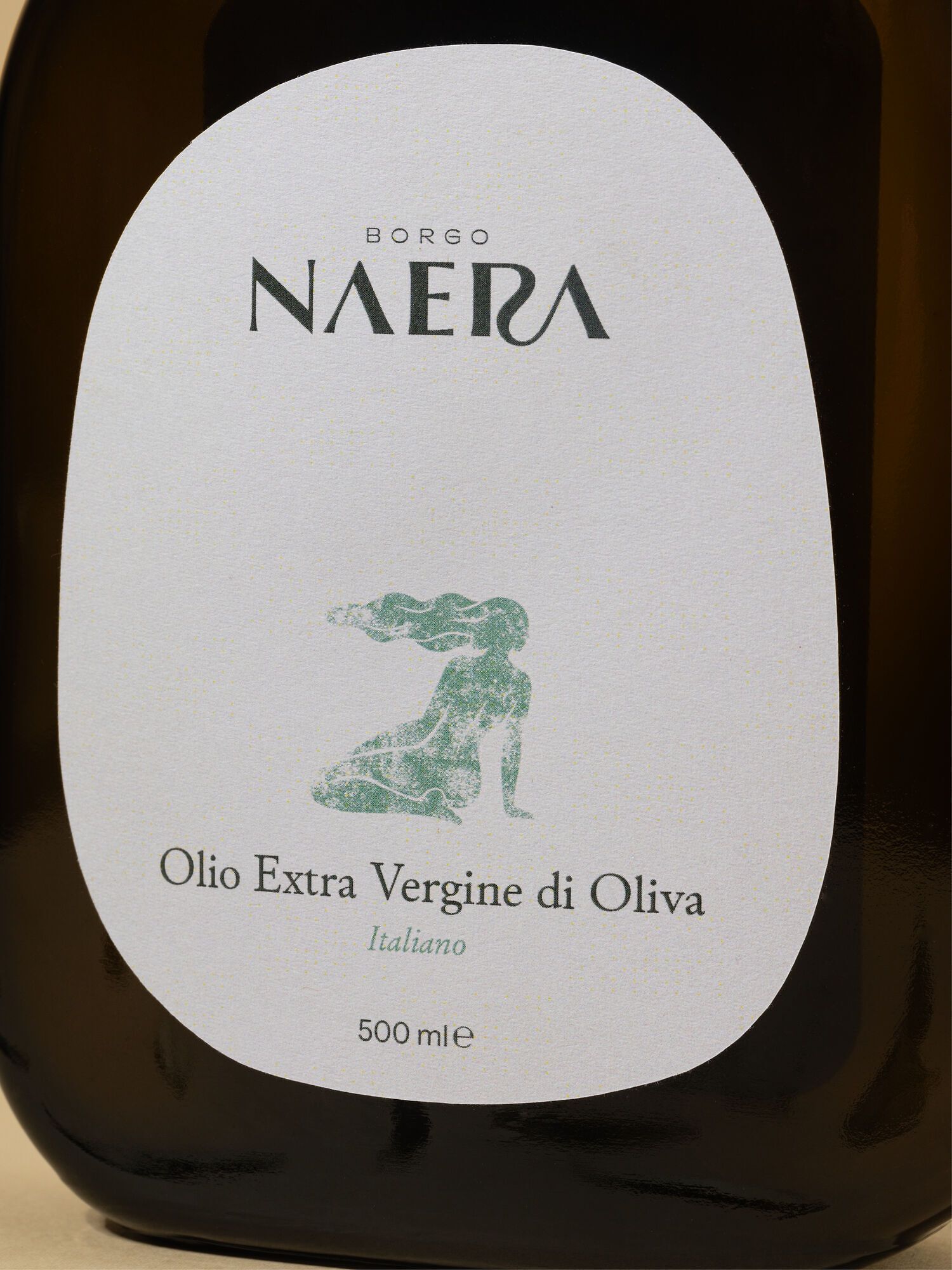 L’etichetta è stata progettata per comunicare qualità senza ostentazione. Il layout è arioso, pulito, con una gerarchia chiara delle informazioni e una scelta cromatica misurata, pensata per dialogare con le forme sinuose della bottiglia. Il segno illustrato centrale introduce una figura femminile ispirata all’immaginario mitologico delle ninfe, da cui prende origine il nome Naera. Una presenza evocativa che richiama natura, acqua e radici mediterranee profonde.