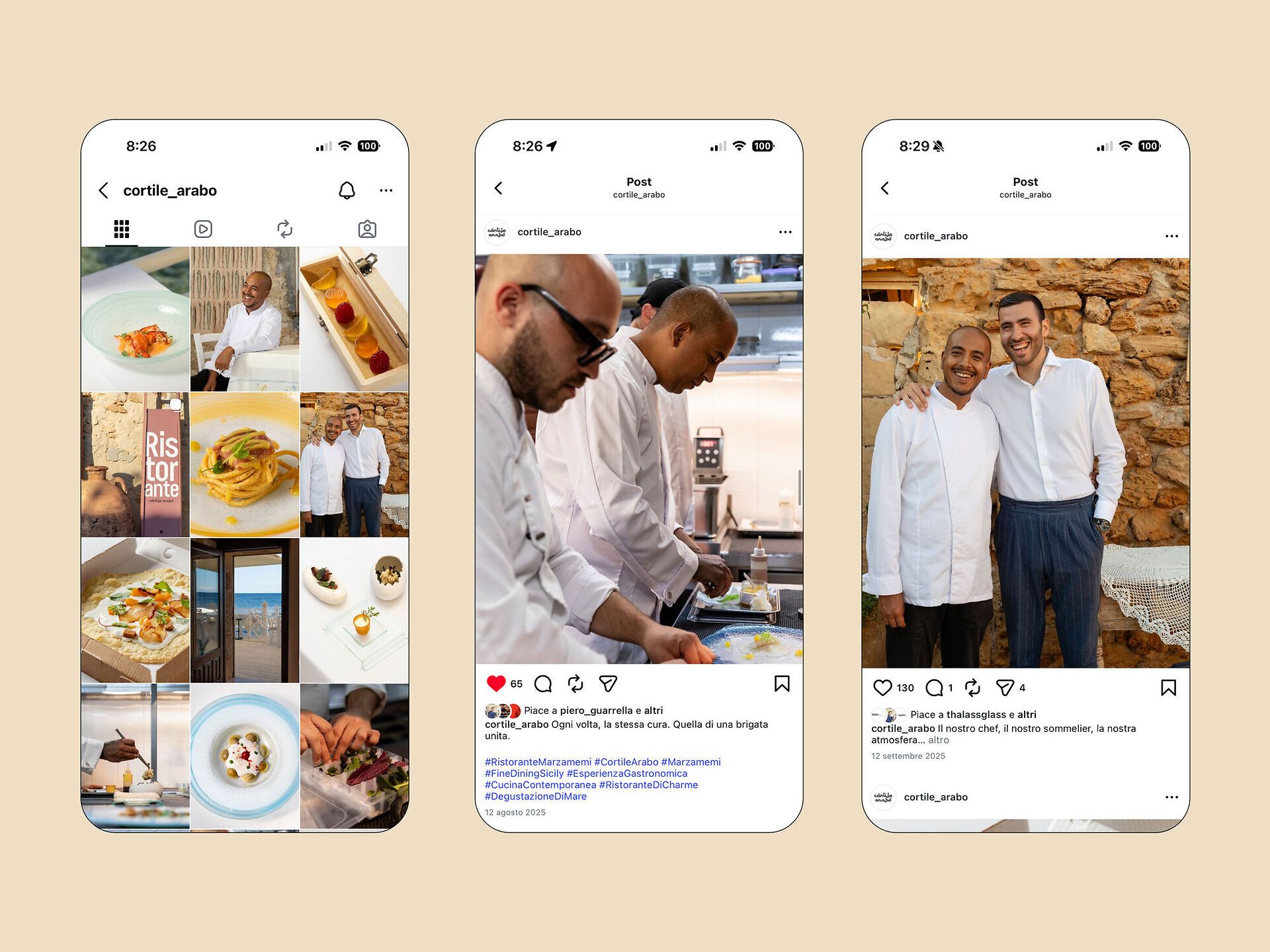 La presenza social è stata costruita attraverso una strategia editoriale coerente con il DNA del brand: contenuti visivi curati, una narrazione legata al mare, al territorio e alla stagionalità degli ingredienti, e un tono di voce asciutto, competente e accessibile. Il risultato è uno spazio social armonico, capace di riflettere la filosofia culinaria e l’eleganza contemporanea di Cortile Arabo.